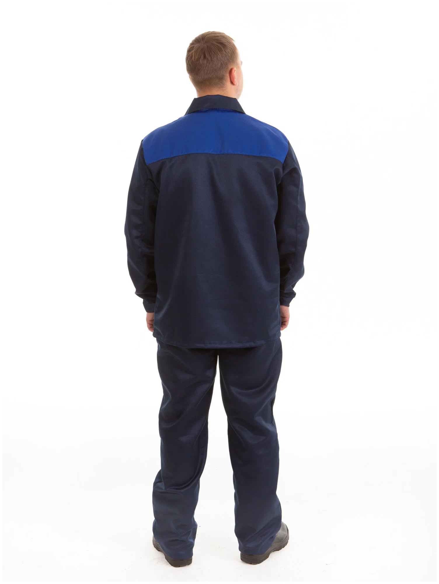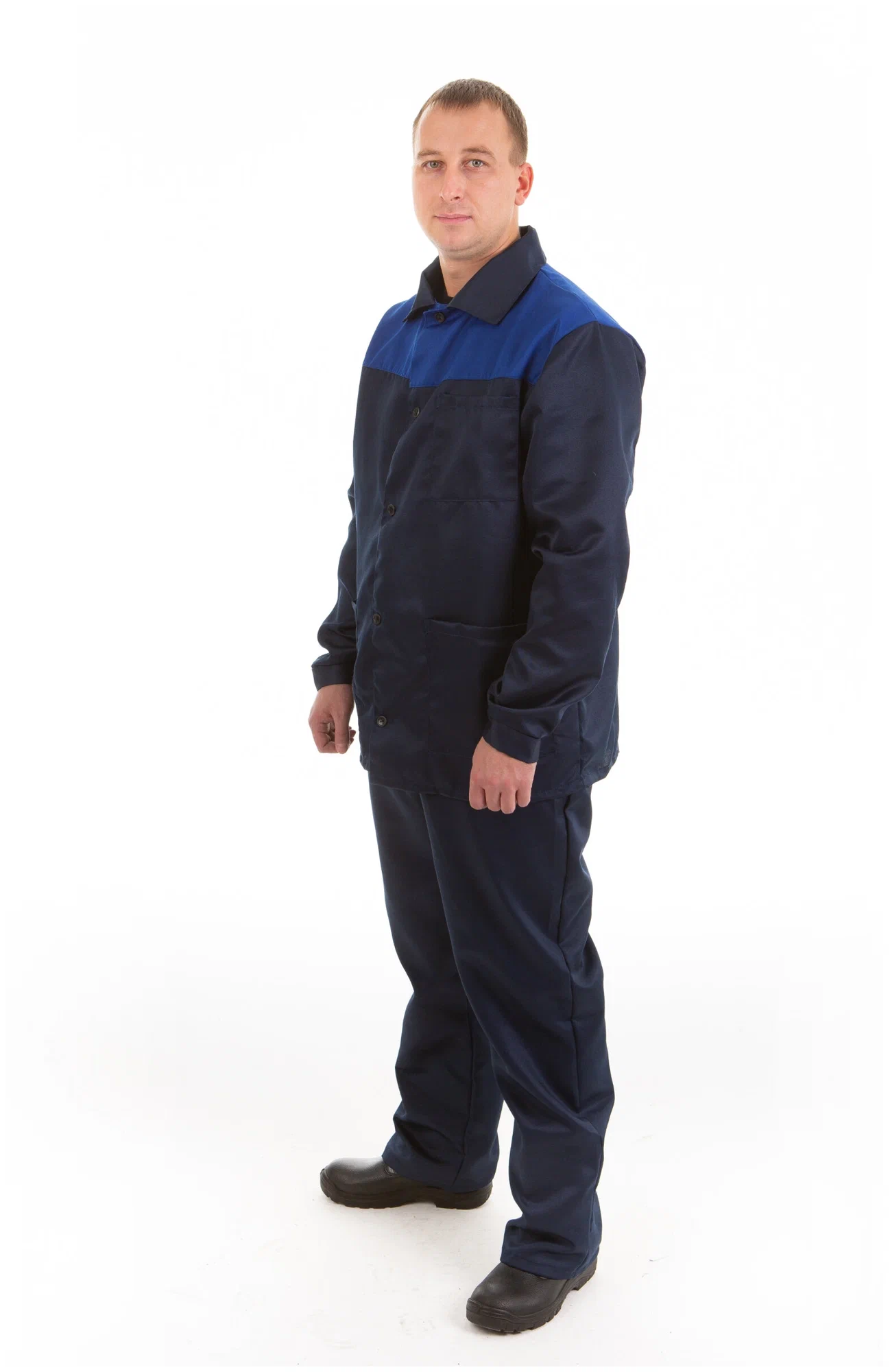 Костюм состоит из куртки и брюк. Куртка прямого кроя с центральной бортовой застежкой на петли и пуговицы. Воротник отложной. Один нагрудный накладной карман без клапана и два нижних накладных кармана. Рукава с манжетами, застегивающимися на пуговицу. Полочки и спинка на кокетках контрастного цвета. Брюки с застежкой гульфика на пуговицы. Передние половинки с двумя накладными карманами с наклонным входом.